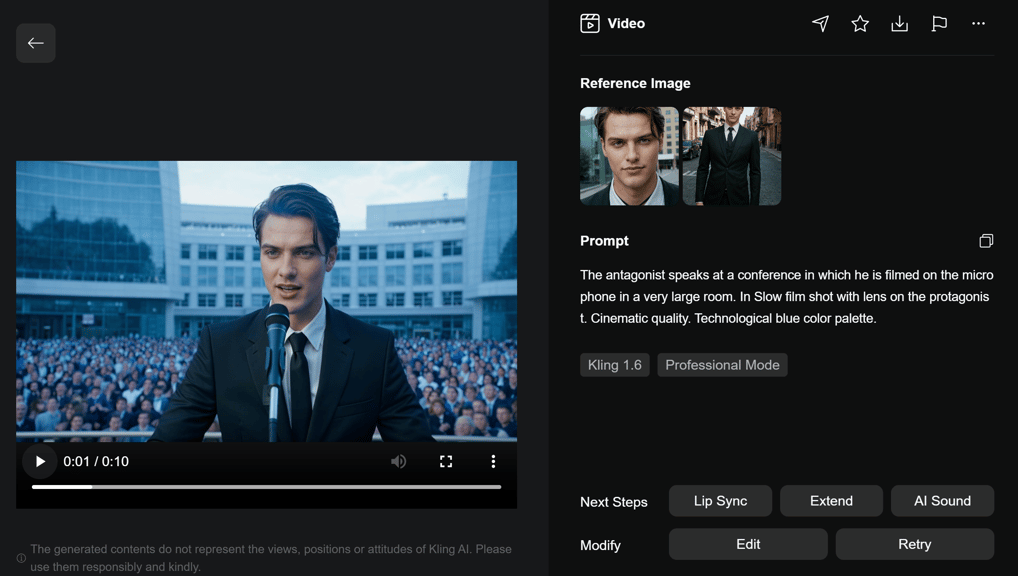 Per la realizzazione delle scene con gli attori ho utilizzato Kling AI, impiegando prompt testuali sviluppati sulla base delle immagini di riferimento precedentemente generate tramite la piattaforma di creazione degli avatar. In totale sono state generate 44 clip, di cui ne sono state utilizzate 6.