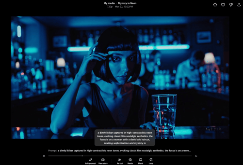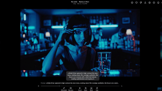 Prompt: “un bar scarsamente illuminato, ripreso in tonalità blu neon ad alto contrasto, che evocano l’estetica nostalgica dei film classici. l’attenzione si concentra su una donna con un elegante taglio di capelli a caschetto, che emana raffinatezza e mistero.”