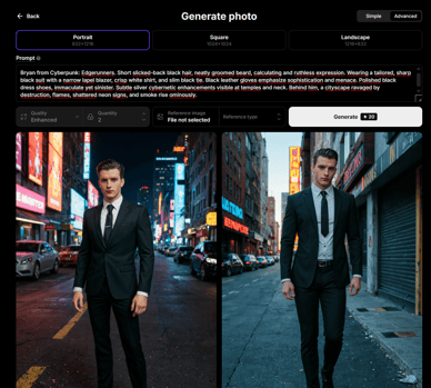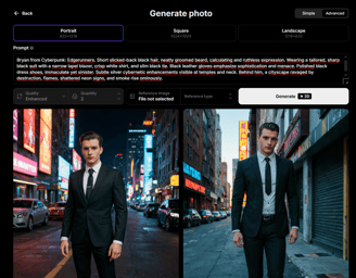 Prompt: “Capelli corti e neri, barba curata, espressione calcolatrice e spietata. Indossa un abito nero tagliente e sartoriale con blazer a revers stretti, camicia bianca e cravatta nera sottile. I guanti di pelle nera sottolineano la raffinatezza e la minaccia. Scarpe nere lucide, immacolate e sinistre. Sottili miglioramenti cibernetici argentati visibili alle tempie e al collo. Alle sue spalle, un paesaggio urbano devastato dalla distruzione, fiamme, insegne al neon in frantumi e fumo si levano minacciosi”