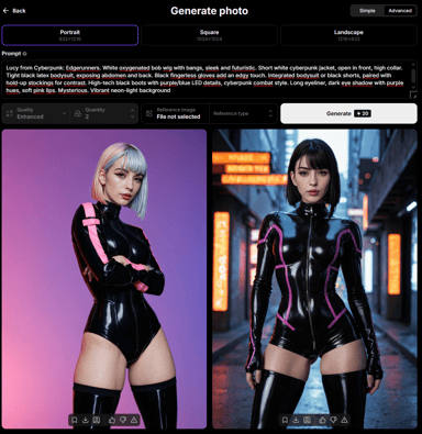 Prompt: “Lucy di Cyberpunk: Edgerunners. Parrucca bianca ossigenata con frangia, elegante e futuristica. Giacca cyberpunk bianca corta, aperta sul davanti, con collo alto. Body aderente in lattice nero, che espone l’addome e la schiena. I guanti neri senza dita aggiungono un tocco di stile. Body integrato o pantaloncini neri, abbinati a calze autoreggenti per contrasto. Stivali neri high-tech con dettagli LED viola/blu, stile cyberpunk da combattimento. Eye-liner lungo, ombretto scuro con sfumature viola, labbra rosa tenue. Misterioso. Sfondo vibrante di luce al neon”